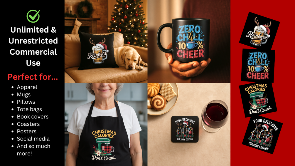 Expect a festive spectrum from glossy modern-chic ornaments to adorable holiday dog themes — all polished, ready to use, and perfectly suited for tees, stickers, mugs, totes, cards, and wall art that radiate effortless Christmas charm.