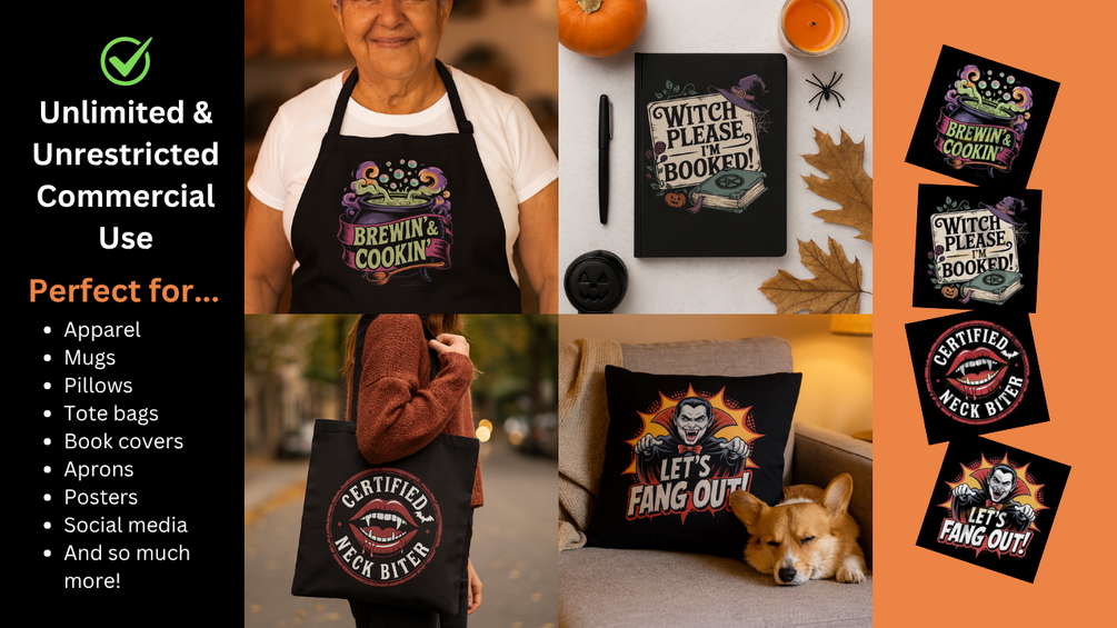 Inside, you’ll find an eclectic mix of Halloween imagery — from candy corns and haunted houses to witches, werewolves, vampires, ghosts, pumpkins, and more. The collection spans multiple styles, from kawaii charm to dark gothic horror, giving you endless options for apparel, stickers, posters, mugs, and beyond.